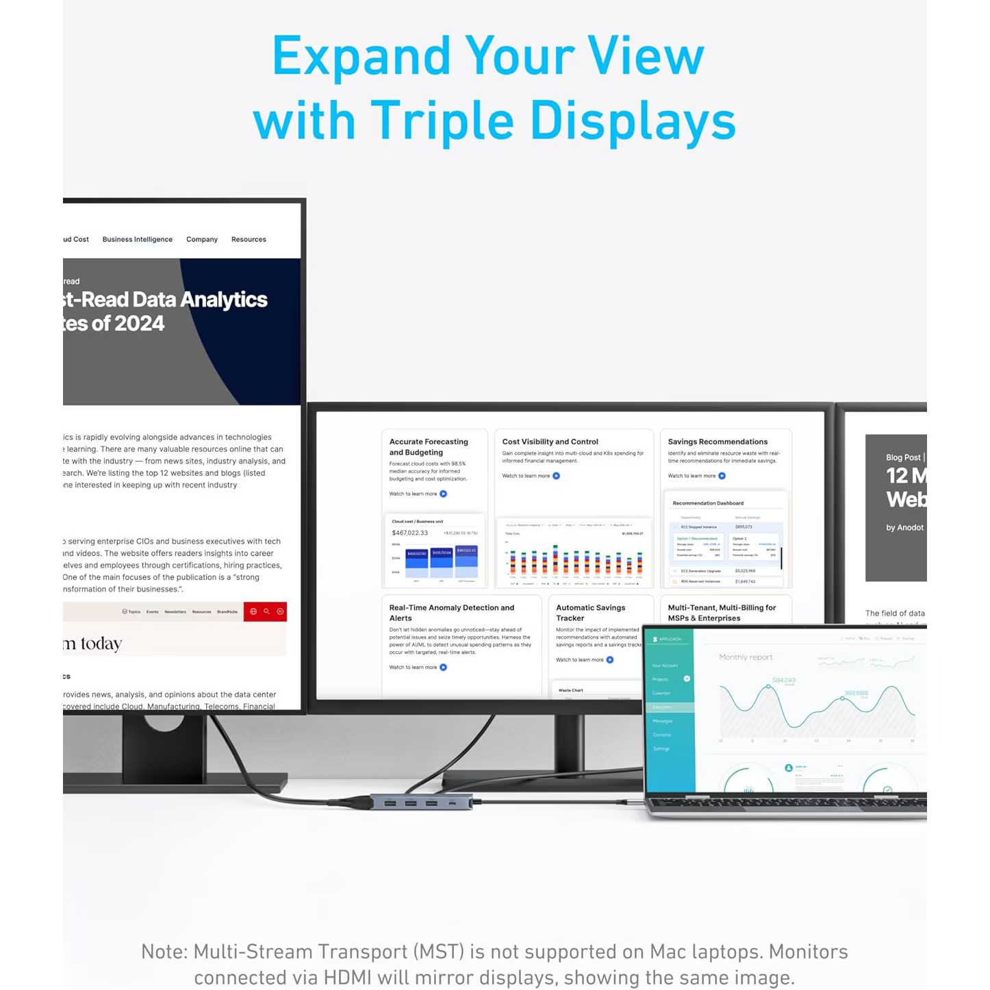 all in a single compact device. It allows simultaneous connection to up to three external monitors, fast file transfers through USB 3.0 ports, and