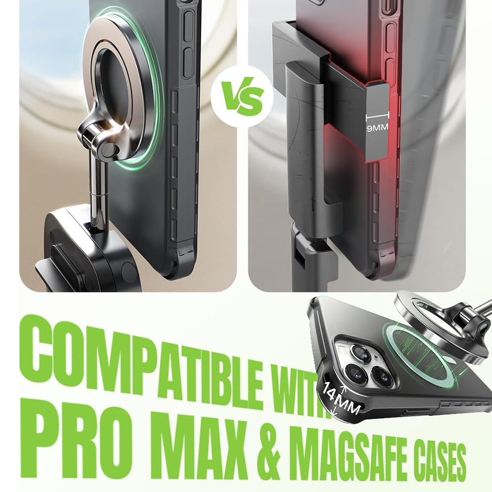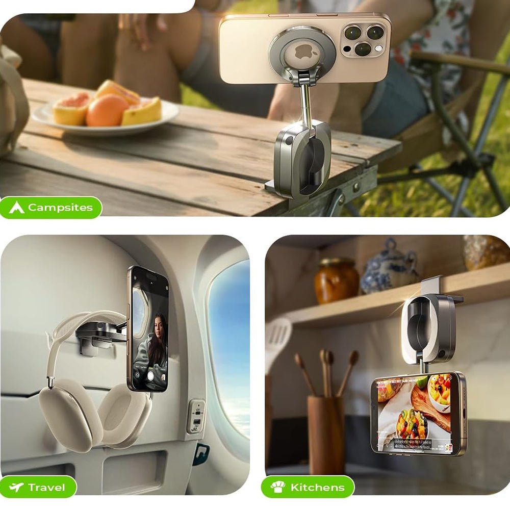 Looking for a phone holder that can accompany you anywhere? Its versatility allows mounting on airplane foldable tables, luggage handles, desks. Use anywhere, without compromises Thanks to its metal construction and base compatible with flat surfaces up to 1.18 inches, the Lisen holder is efficient in various scenarios. Reliable stability The contact clamp features a dual military-grade spring system, which securely fixes the phone even in turbulent conditions. Essential accessory for travel Designed for total mobility, this premium MagSafe holder attaches the device in just 0.1 seconds, eliminating awkward adjustments. Specifications: Type of holder: universal; Materials: aluminum alloy, silicone, polycarbonate; Mounting: flat surfaces up to 1.18 inches (30 mm); Compatibility: MagSafe devices, MagSafe cases / accessories; Dimensions: 63 x 63 x 4.7mm; Weight: 140g.