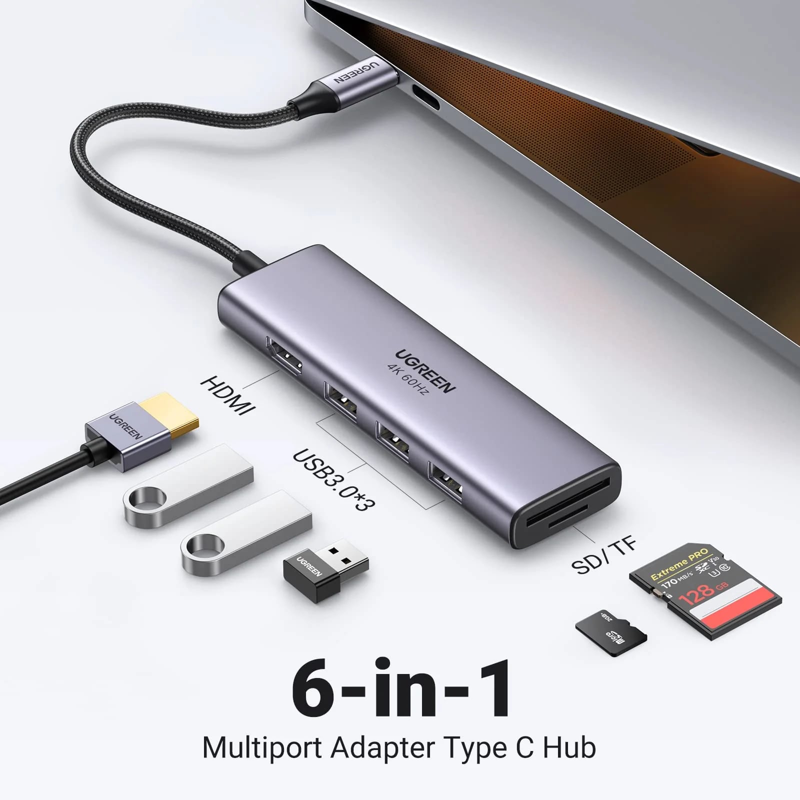 UGREEN CM511 USB-C Hub (60383), 3 x USB-A 3.2 - 1 x HDMI - 1 x SD - 1 x microSD, Gray