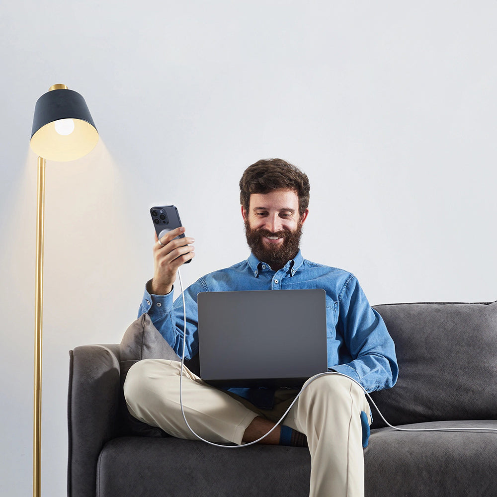 without additional cables. It is equipped with an integrated USB-C cable, 1.5 meters long, with textile protection against wear and tangling.
