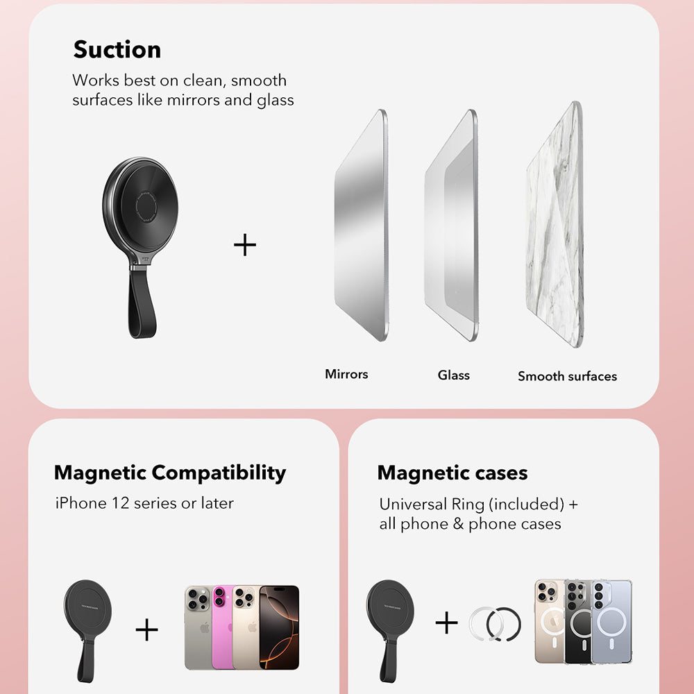 Har en kraftig sugekop, der sikrer en sikker fastgørelse på enhver ren og glat overflade.