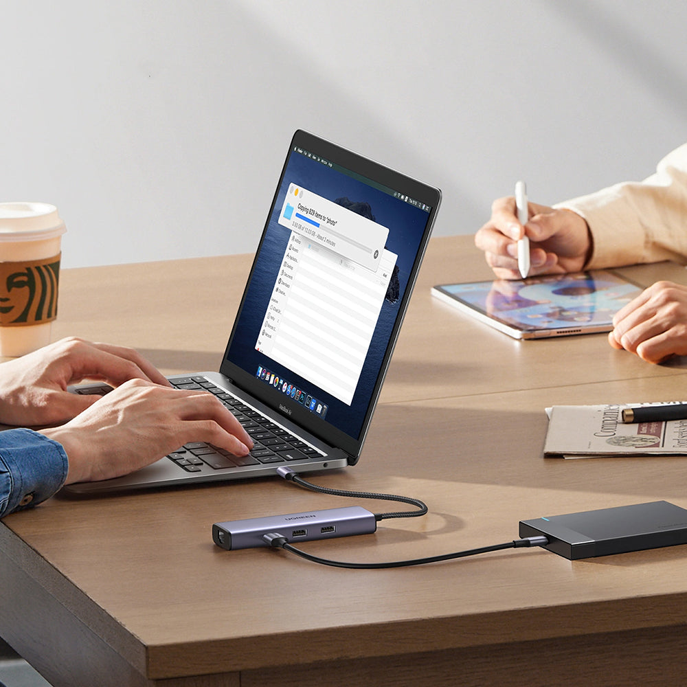 udvide skærmen og oplade udstyr hurtigt og effektivt. Med overførselshastigheder på op til 5 Gbps sikrer UGREEN hub'en hurtig
