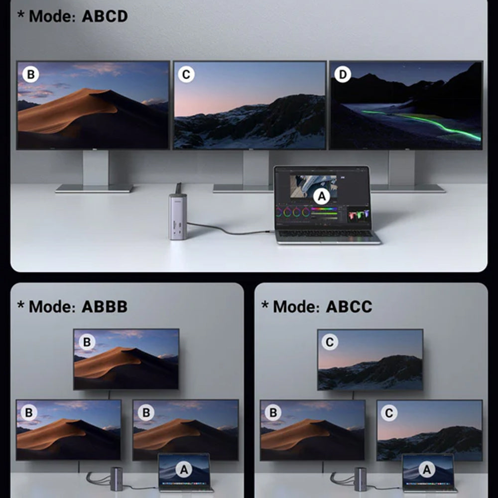 UGREEN Pro CM555 hubben omdanner enhver bærbar til en komplet arbejdsstation og tilbyder 12 porte til video, data, netværk og opladning.