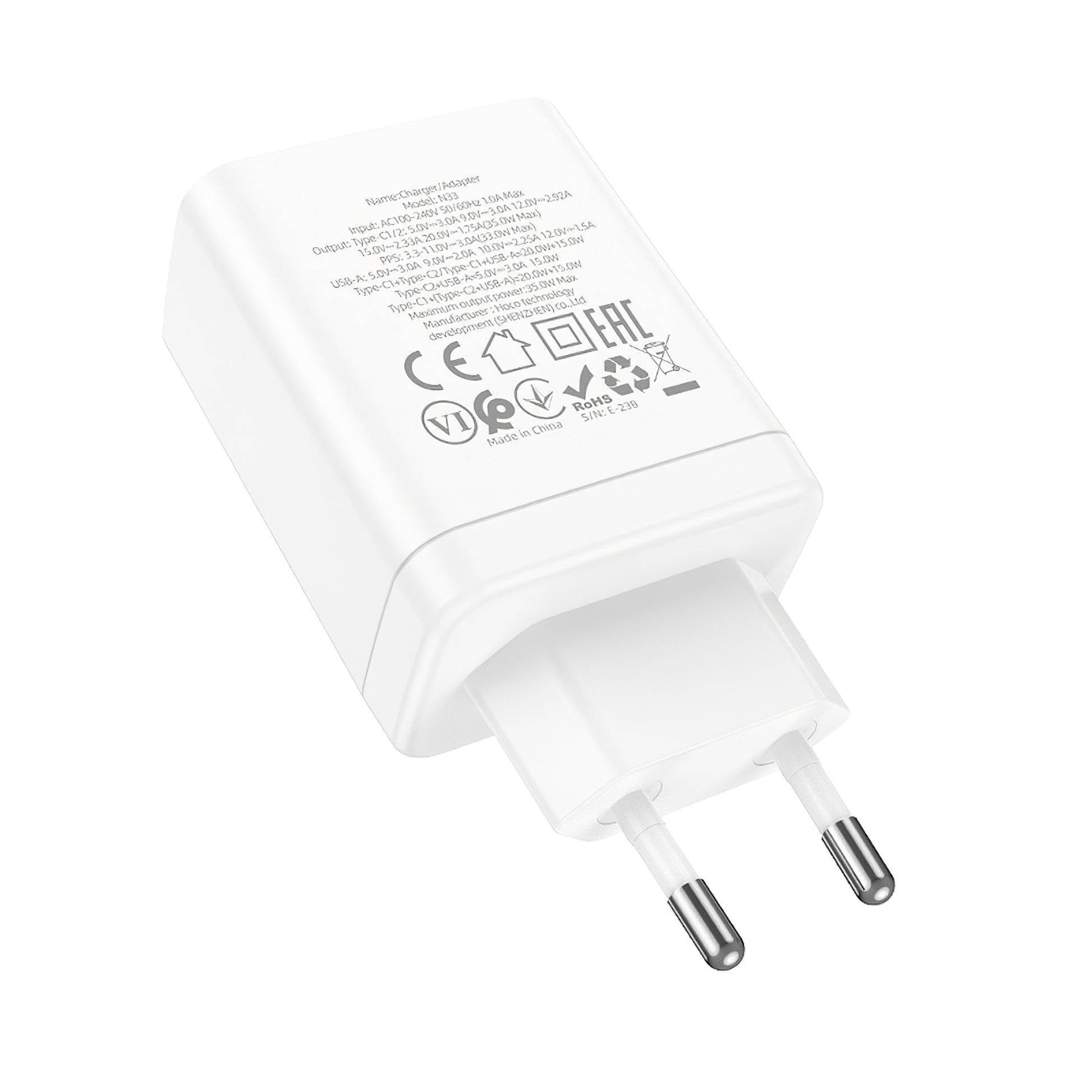 | Udgang | USB-A (5V / 3A / 9V / 2.2A / 10V / 2.25A / 12V / 1.5A) / USB-C (5V / 3A / 9V / 3A / 12V / 2.92A / 15V / 2.33A / 20V / 1.75A) |