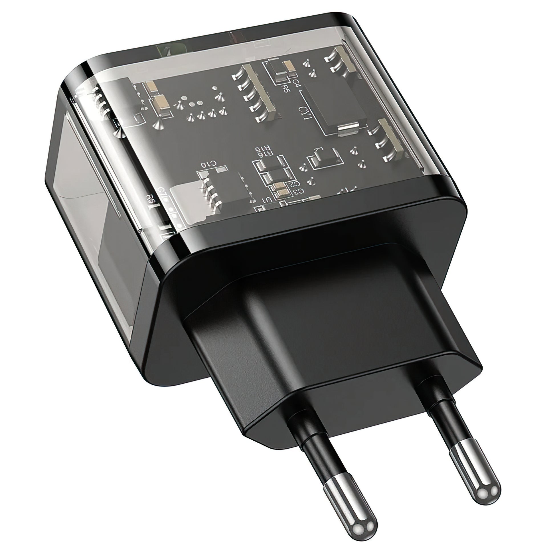 Hoco N34 er en transparent vægoplader med hurtig opladning og dobbelt udgang, ideel til effektiv strømforsyning af to enheder samtidigt.