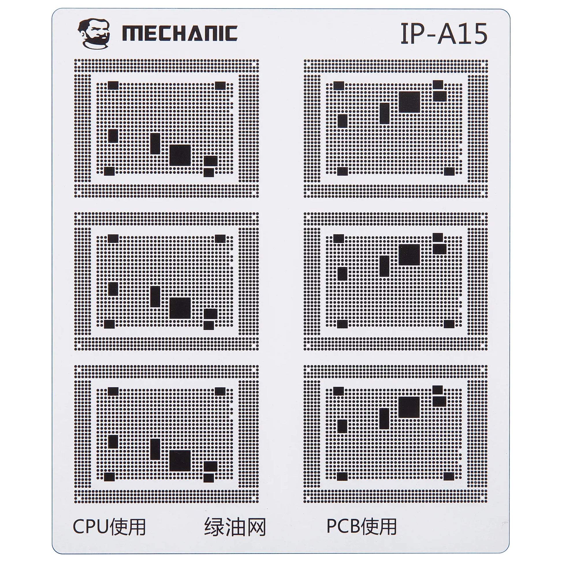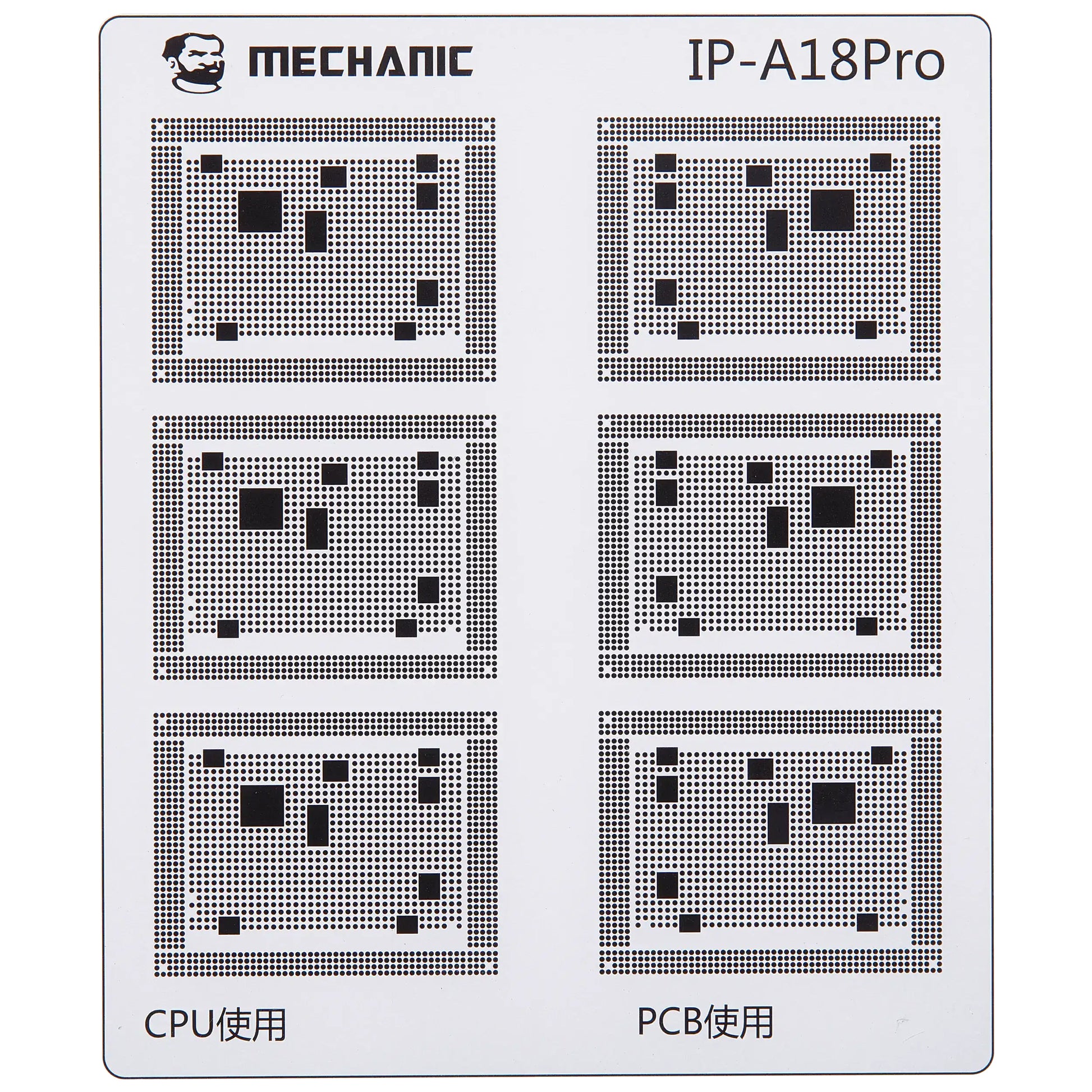 Denne skabelon er specielt designet til arbejde med grøn olie (green oil) og dækker hele rækken af Apple A8 til A18 Pro processorer.
