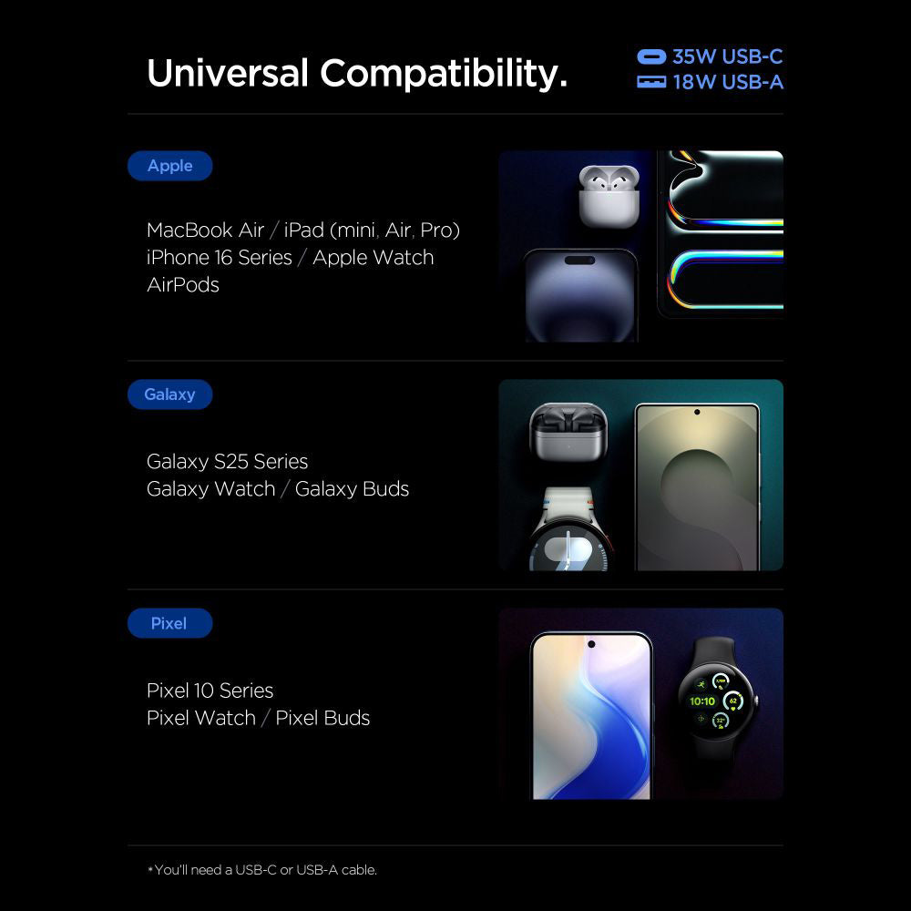 • Spigen integrerer 2 separate porte, så du kan oplade en moderne Type-C enhed og et USB-kompatibelt tilbehør samtidigt.