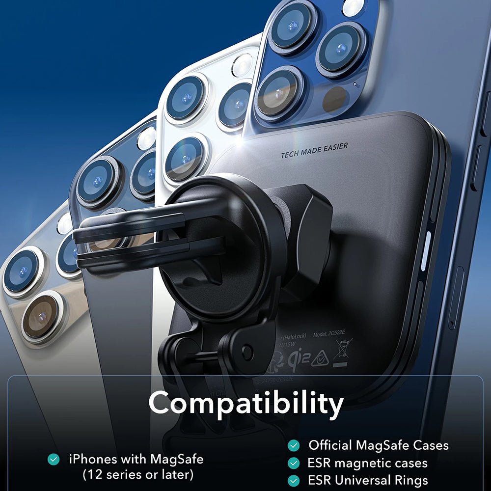 Halolock QI2 er samtidig en stabil holder og en trådløs oplader, der kan monteres i ventilationsgitteret eller på bilens instrumentbræt.