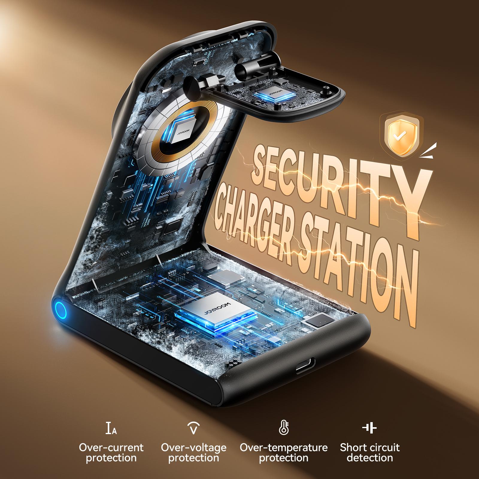 Slip for sammenfiltrede kabler og nyd trådløs opladning med Joyroom JR-W15, en 3-i-1 station ideel til kontoret eller hjemmet.