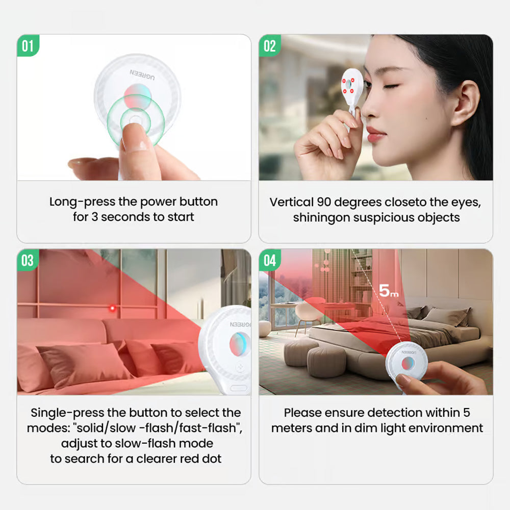 Ugreen-detektoren identificerer hurtigt spionkameraer og andre skjulte overvågningsenheder, hvilket giver sikkerhed i hoteller eller lejede rum.